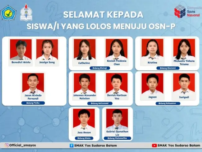 Batam, YTKNews.id-Berita bahagia kembali datang dari SMAK Yos Sudarso Batam. Empat siswa berhasil melaju ke Olimpiade Sains Nasional 2023 setelah